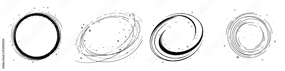 Set of four abstract black and white swirling circular brush stroke frames