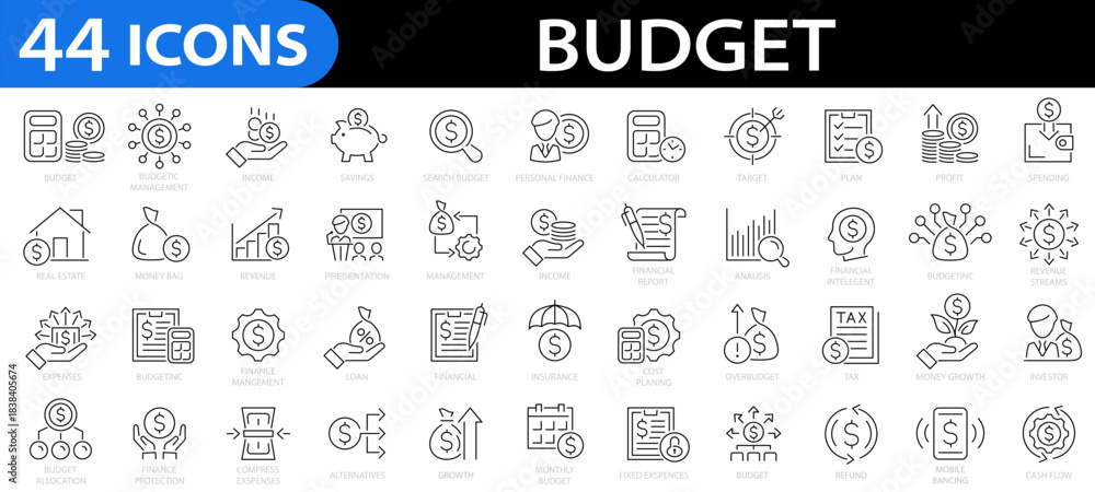 Budget line icon set. Accounting, bookkeeping, distribution, banking, business, expense, money management, spending, income, profit, investment and more. Editable icons. Vector illustration