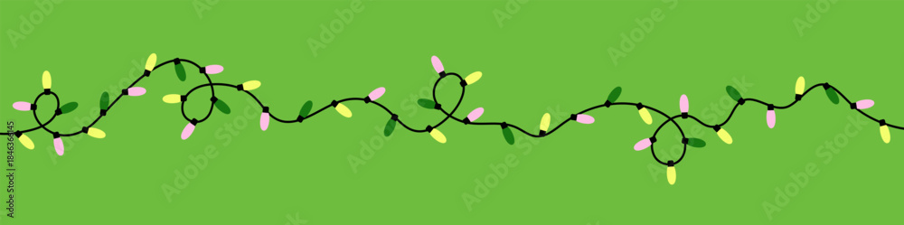 Christmas light garland. Holiday string decoration with festive lightbulb ornaments. Seasonal electric illumination, horizontal hanging adornment, decor. Xmas bulbs on cable. Flat vector illustration