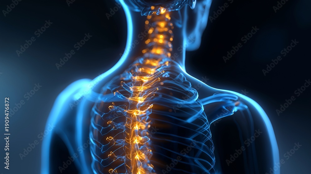 HOME>Fototapeta>Medizinische 3D-Darstellung der menschlichen Halswirbelsäule mit leuchtend orangefarbener Schmerzvisualisierung auf schwarzem Hintergrund