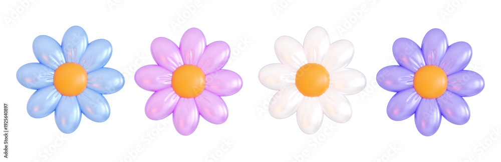 HOME>Fototapeta>Set of 3D chamomile flower icons with glossy plastic and metallic texture, futuristic Y2K aesthetic daisy blossom in blue, pink, white and purple colors, modern spring floral element