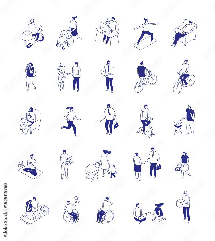 HOME>Fototapeta>Isometric line people isolated set of characters in active everyday situations on white background. Minimal blue outline lifestyle bundle