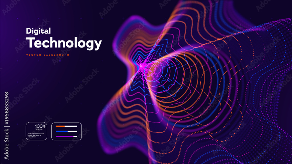 HOME>Fototapeta>Abstract Technology Background With Colorful Neon Waves And Dynamic Particle Lines. Big Data Flow And Digital Network Concept. Technology Innovations And Data Systems. Vector Illustration.