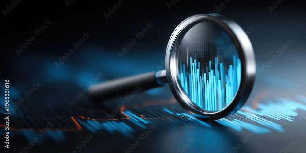 Magnifying glass over glowing blue financial data charts and graphs on dark background