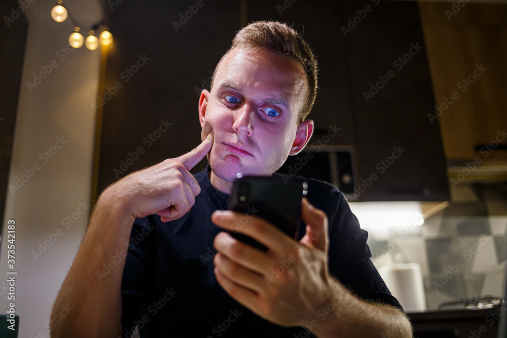 HOME>Fototapeta>Young man businessman working at home, sitting at the kitchen table with laptop, looking at a mobile phone. Successful entrepreneur sits and works independently in his modern home.