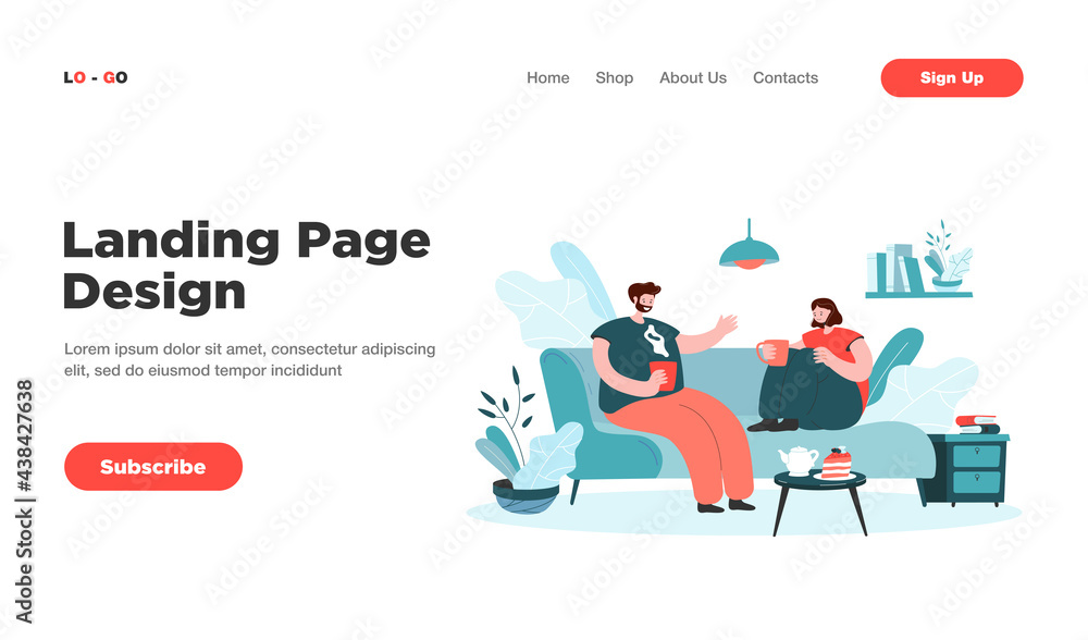 HOME>Fototapeta>Young couple spending romantic evening together in their apartment. Man and woman sitting on sofa in cozy room, drinking coffee and talking. Vector illustration for love, home, hygge concept