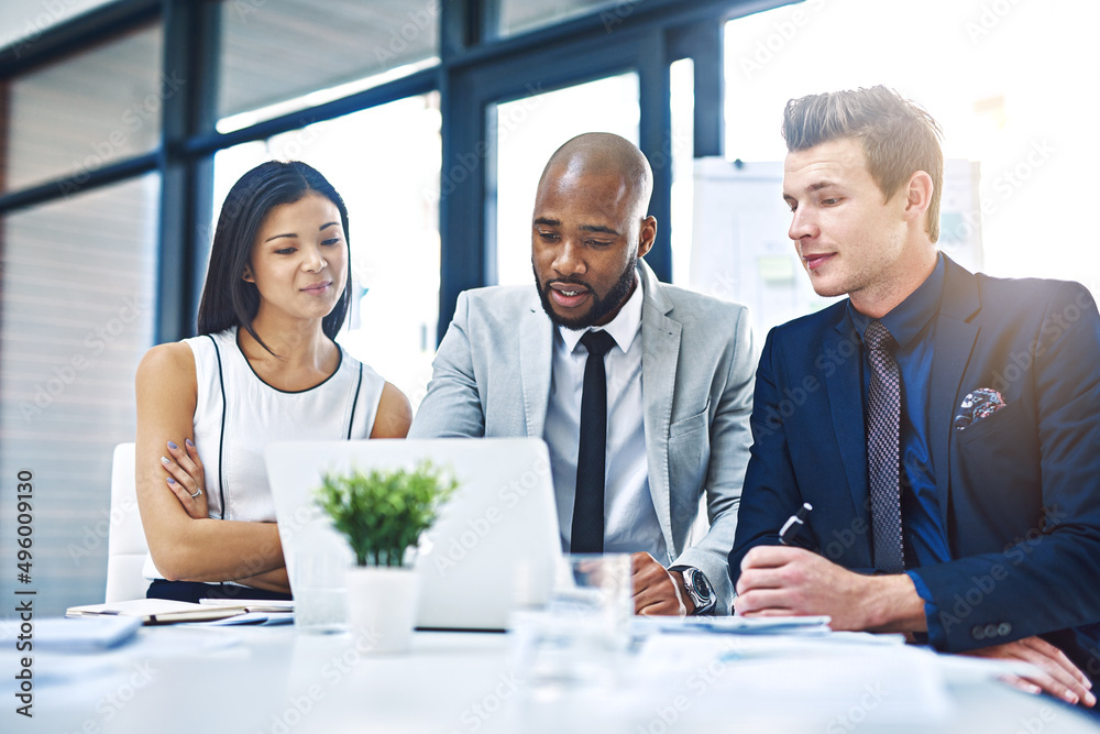HOME>Fototapeta>Success is the product of teamwork. Cropped shot of a group of young businesspeople having a discussion while using a laptop in a modern office.