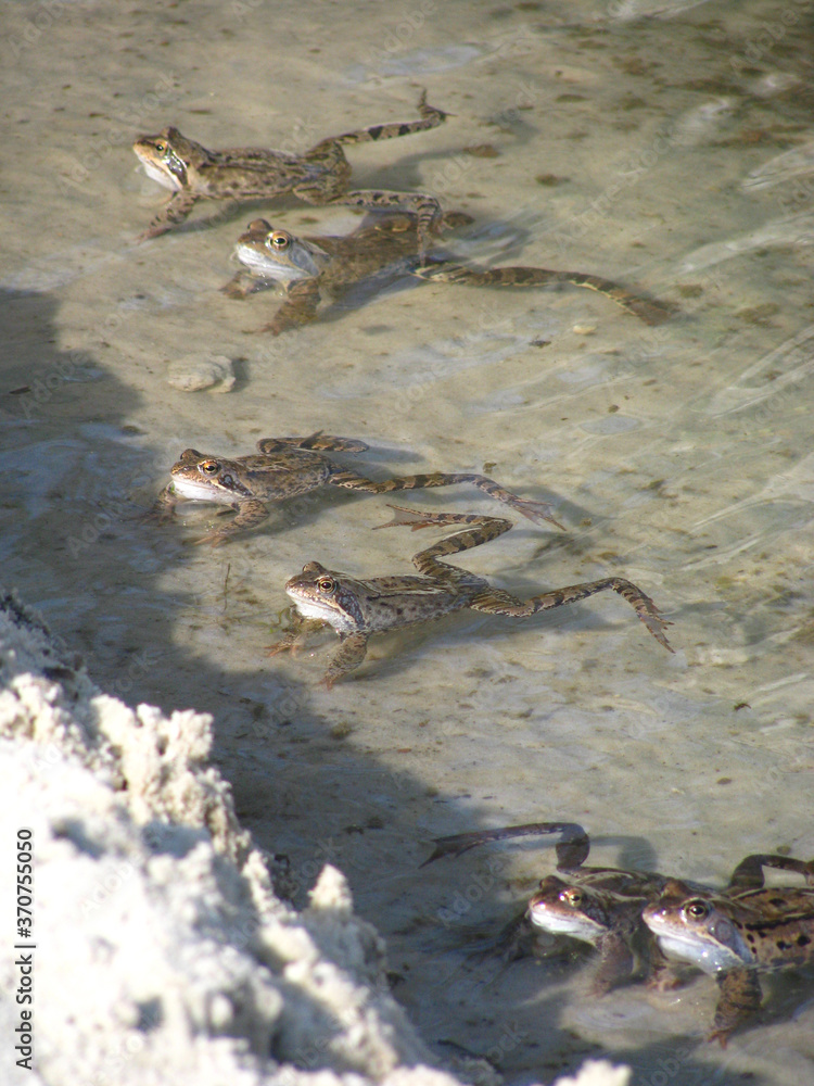 Mnóstwo żab na piaszczystym brzegu jeziora