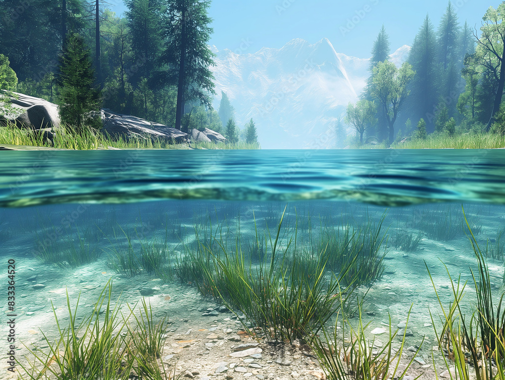HOME>Fototapeta>Piękny, zachwycający widok na górskie jezioro wśród lasów. Woda jeziora lazurowa, krystalicznie czysta, przejrzysta z wyraźnie widocznym dnem