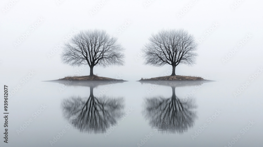 Na małej wyspie znajdują się dwa nagie drzewa, które doskonale odbijają się w spokojnej, mgławicowej wodzie jeziora pod szarym niebem.