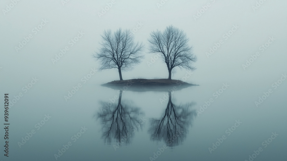 Na małej wyspie znajdują się dwa nagie drzewa, które doskonale odbijają się w spokojnej, mgławicowej wodzie jeziora pod szarym niebem.