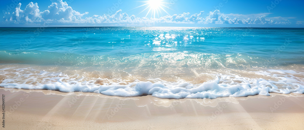 rozmyte tło wakacyjne z idylliczną plażą. Promienie słońca odbijające się w falach błękitnego morza.