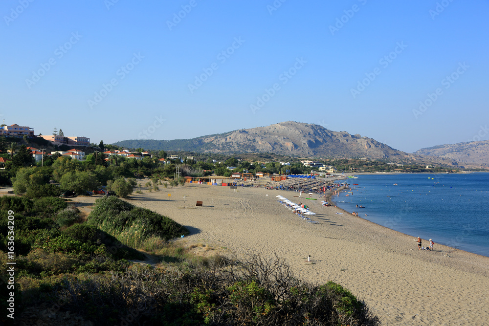 Piękna plaża na Rodos w Grecji, parasole i leżaki na plaży wzdłuż morza.