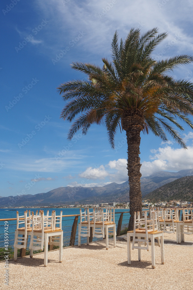 Złożone krzesła i stoły na tle palmy, morza i gór, Kreta, Grecja