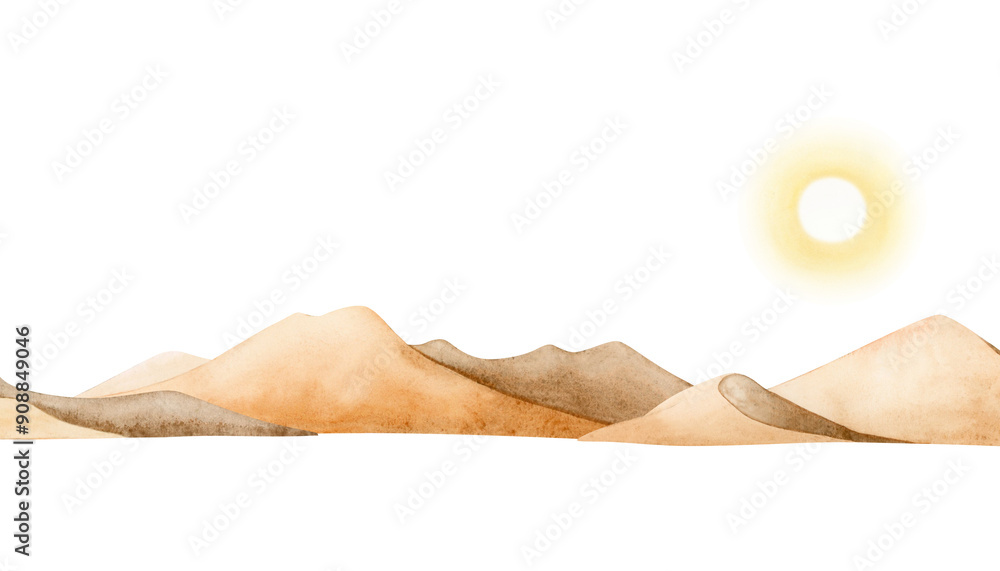 HOME>Fototapeta>Elegant desert landscape with sun and sand dunes watercolor illustration isolated on white background. Monochrome sunrise sketch in beige and yellow colors. Panoramic horizontal clipart