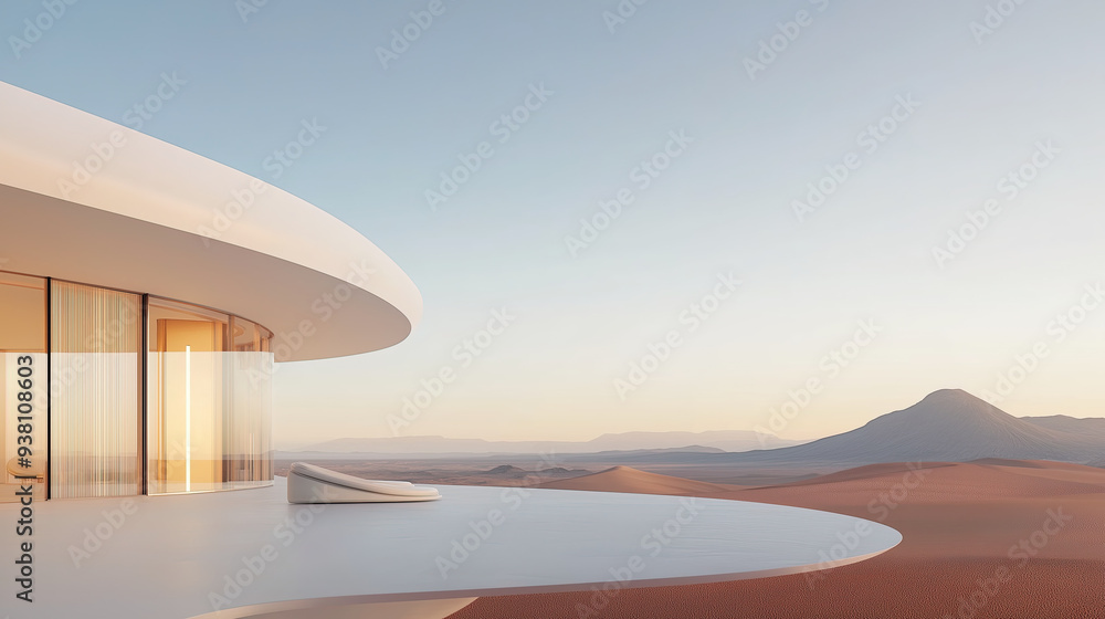 White luxury modern villa with beautiful desert view, minimalist curve line design, scene for car presentation