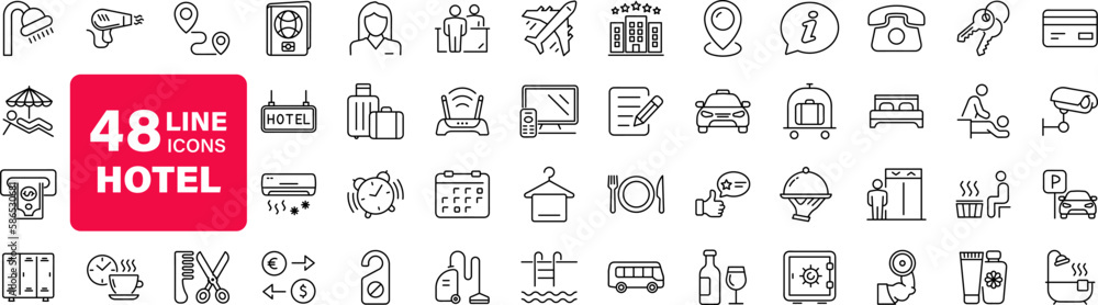 Hotel set of web icons in line style. Hotel and vacation icons for web and mobile app. Hotel services, recreational rest, relax, travel. Vector illustration