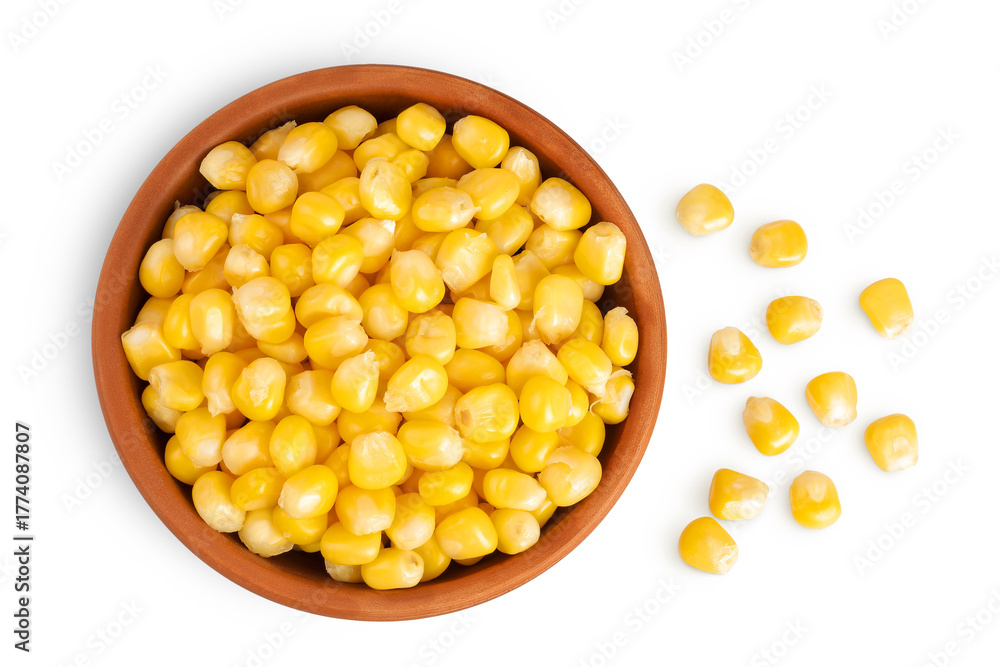 corn seeds in ceramic bowl isolated on white background. Top view. Flat lay