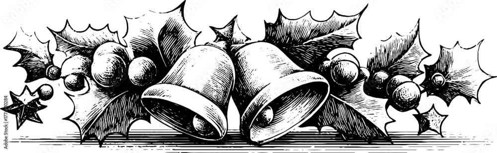 Festive christmas border with bells stars and holly branch for holiday designs