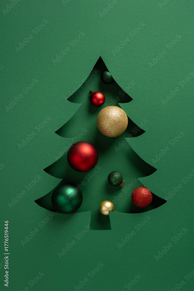 HOME>Obrazy na płótnie Canvas>A green Christmas tree cutout opens to reveal colorful ornaments, capturing the festive mood of the season. Bright red and gold accents create a warm, cheerful greeting for the holidays