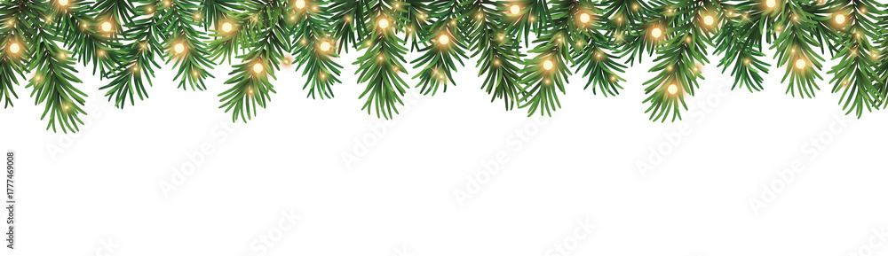 HOME>Obrazy na płótnie Canvas>Seamless decorative vector christmas border with coniferous branches and garlands of christmas lights on transparent background
