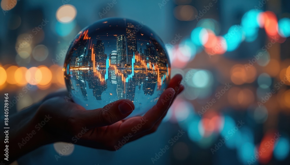 Hand holds crystal ball with stock market chart, cityscape reflection. Financial forecast, investment concept. Business, economy trend prediction with financial graph. Market analysis, investment