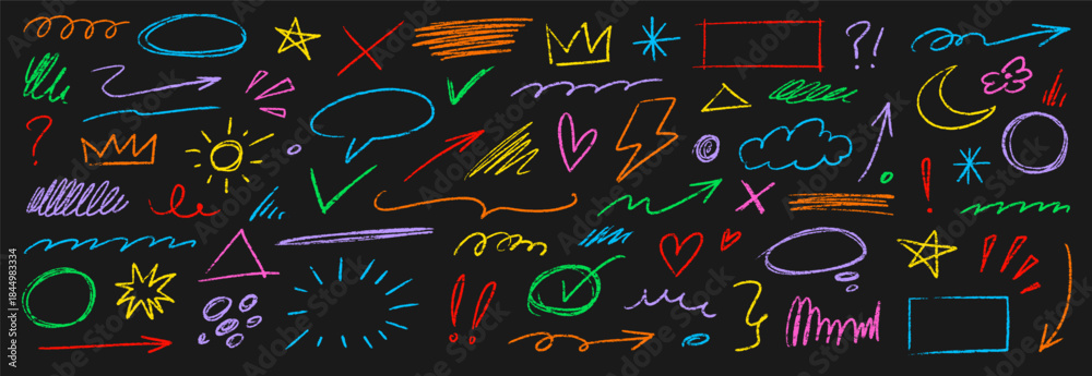 HOME>Obrazy na płótnie Canvas>Pencil color crayon line element set. Hand drawn scribble chalk pencil stroke colorful swirl, flower, cloud and arrow shape with crayon rough texture. Children paint background. Vector illustration