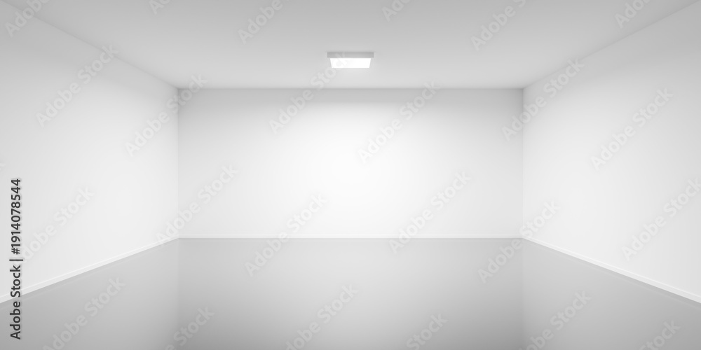 Empty blank white large room background with single square light and grey floor, modern interior template