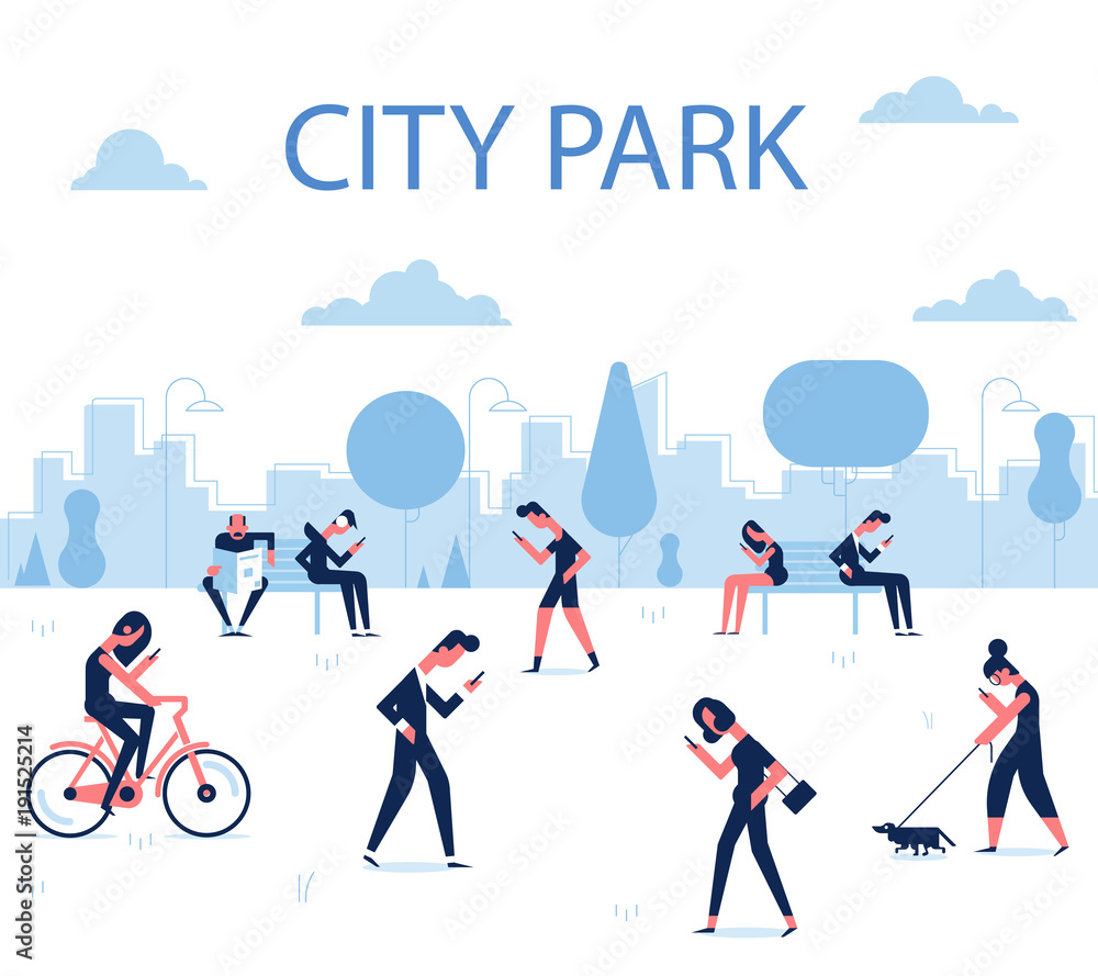 People walking on the urban park using smartphones.City skyline on the background. Vector Elements for infographics. Internet addiction concept of people using mobile gadgets.