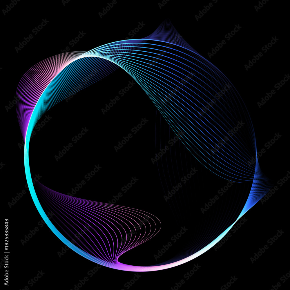 Abstract vector round shape of wavy lines flowing smooth curve colorful spectrum light on black background in concept of technology, science, music, modern.