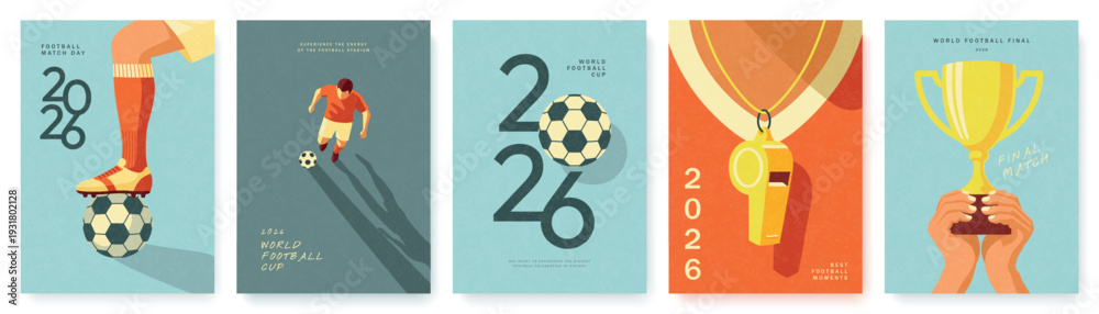 HOME>Obrazy na płótnie Canvas>Set of football tournament posters in flat artistic style with grainy texture featuring championship trophy, whistle, soccer ball and player for World Football Cup 2026 promotion, vector illustration