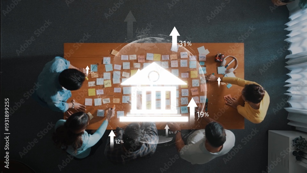 A diverse team engages in strategic planning, using colorful post-it notes and data visuals to foster collaboration in a modern office environment focused on innovation. Raster