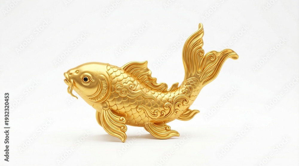 A Golden koi , traditional Chinese, encouraging design, solid gold, smooth rounded polished surface, isolated on white background, minimal shadow