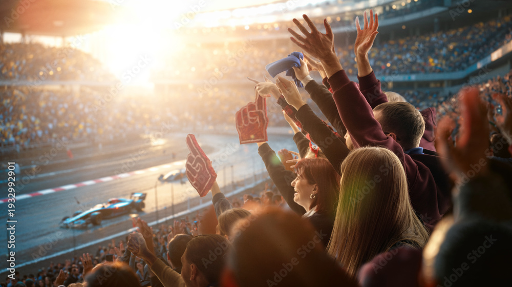 HOME>Obrazy na płótnie Canvas>Fans celebrating motorsport race with raised arms and scarves as cars pass track curve. Concept of race day excitement, audience engagement and commercial sports entertainment atmosphere.