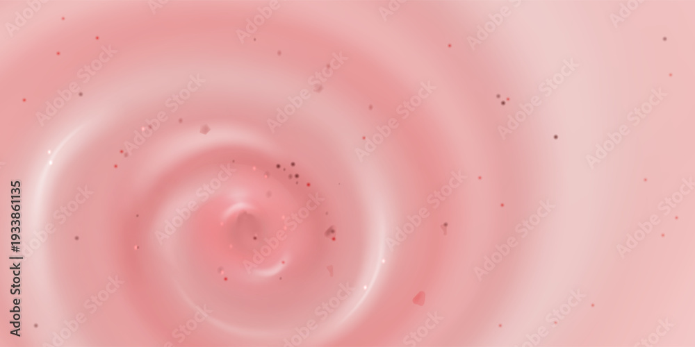 Creamy strawberry yogurt swirl with small particles, realistic vector background. Top view of pink wave pattern, smooth cosmetic texture. Delicious fruity ice cream, dessert or beauty product design