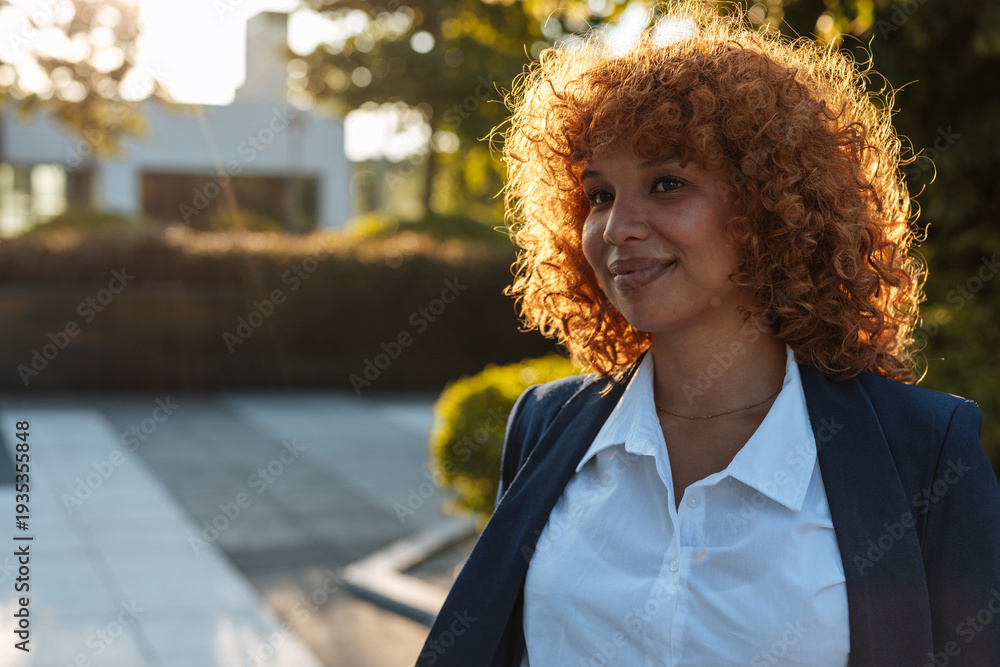 Hispanic business woman portrait at sunset smiling confidently in a professional blazer outdoors