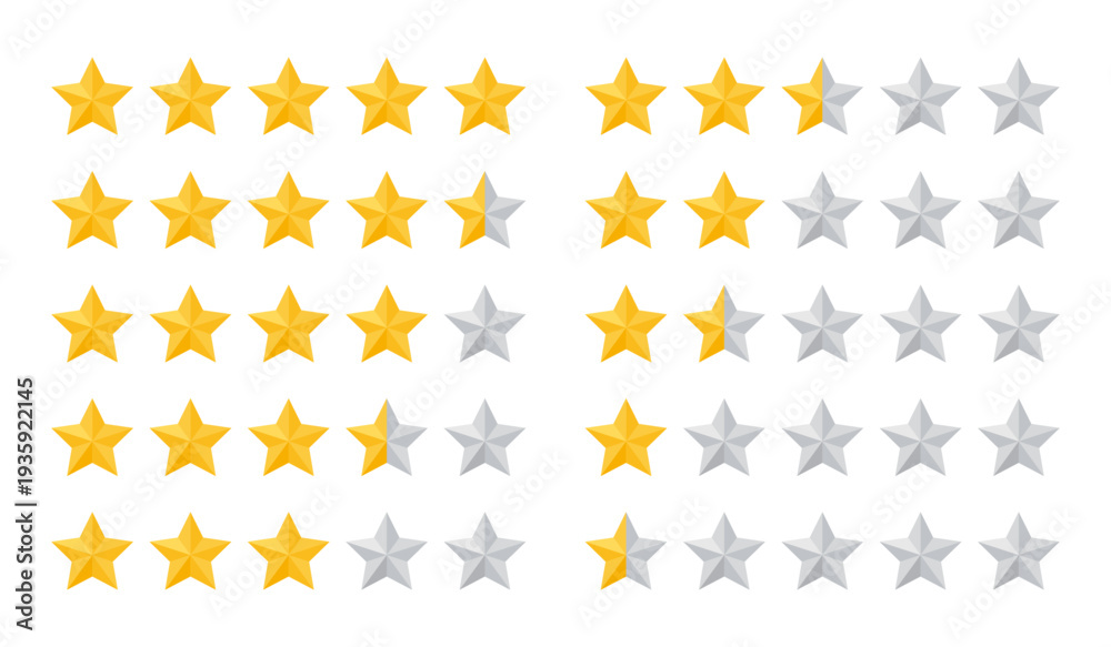 HOME>Obrazy na płótnie Canvas>5 star rate. Five review icons. Yellow gray feedback rating signs. Satisfaction golden mark. Product evaluation rank isolated on white background. Appraisal system quality. Vector illustration.