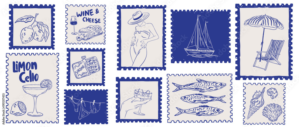 Hand drawn Italian style vacation post stamps. Mediterranean food, sardines, wine and seashell. Amalfi Sicily beach holidays La Dolce vita elements for poster, placard or postcard prints.