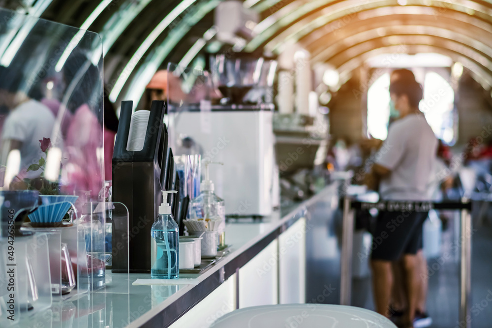 Blue alcohol gel bottle for hand cleaning to prevent the spreading of the Coronavirus (Covid-19) on counter to service for customers at cafe or coffee shop. Healthcare concept. New normal lifestyle.