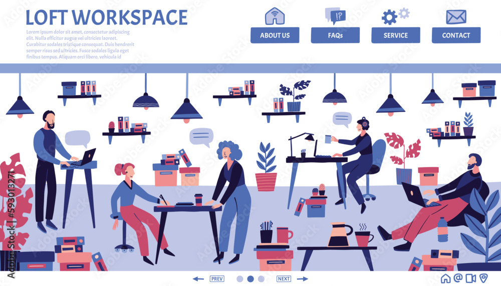 HOME>Obrazy na płótnie Canvas>Doodle loft workspace. Office landing page. Work space for startup team. Coworking room. Social and business workplace. People with computers. Website design. Vector digital concept
